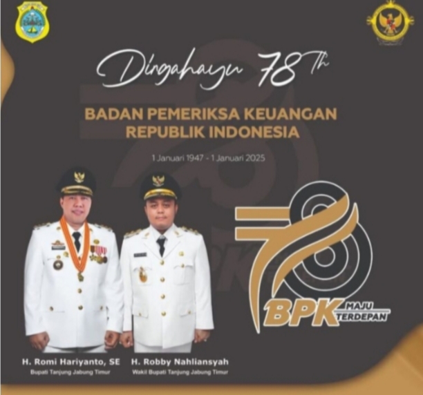 Lacakkjambi.com|Tanjab Timur– Bupati dan Wakil Bupati Tanjung Jabung Timur, H. Romi Hariyanto, SE dan H. Robby Nahliansyah, SH Mengucapkan Selamat Dirgahayu Ke-78 Badan Pemeriksa Keuangan Republik Indonesia ( BPK RI ) 1 Januari 1947 – 1 Januari 2025